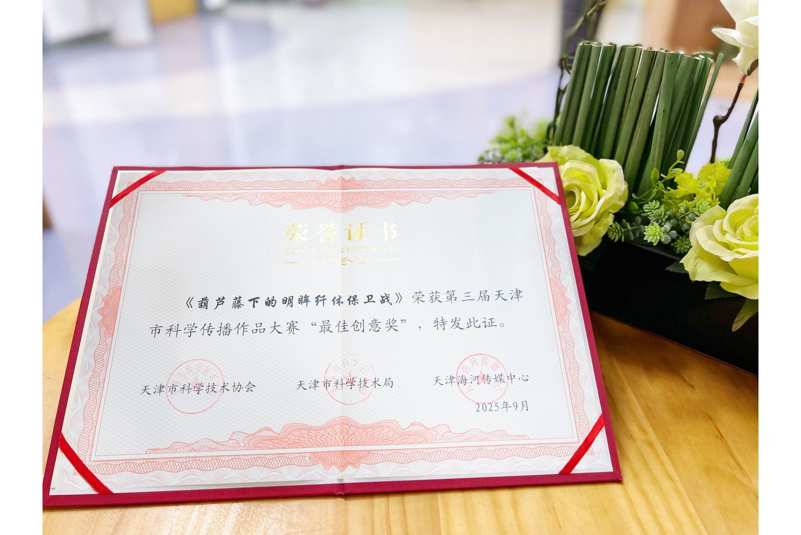 近日,在天津市科学技术协会、天津市科学技术局、天津海河传媒中心组织开展的第三届天津市科学传播作品大赛中,由天津市眼科医院宣传科拍摄制作的科普作品《葫芦藤下的明眸纤体保卫战》荣获第三届天津市科学传播作品大赛“最佳创意奖”。