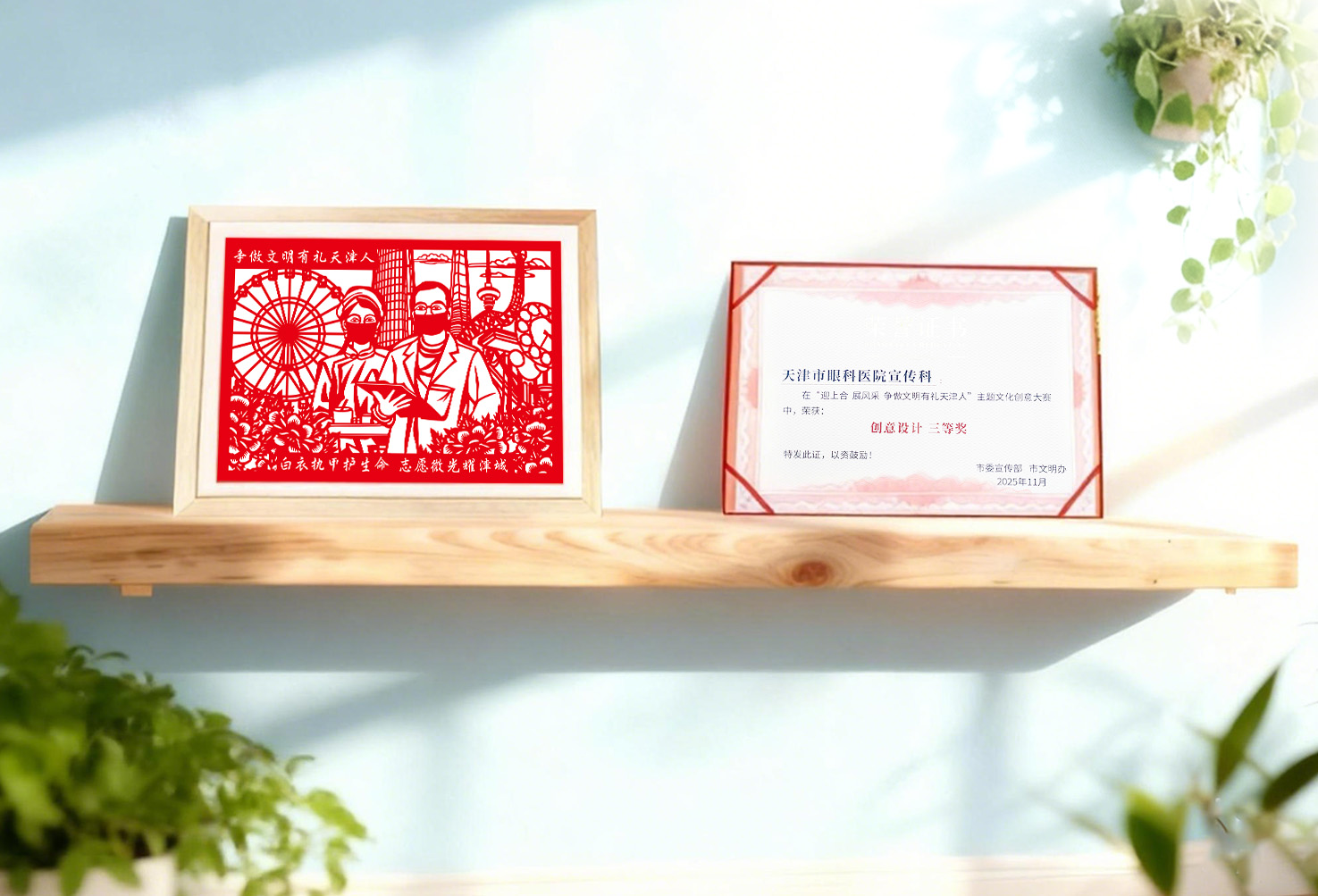 天津市眼科医院宣传科创作的剪纸作品《白衣执甲护生命 志愿微光耀津城》荣获创意设计三等奖。以“白衣执甲”展现广大医务工作者在守护人民健康中的神圣职责与无畏担当。以“志愿微光”生动刻画了医疗志愿服务用点滴善行汇聚暖流,传递城市温度,彰显了天津市民的文明素养与城市的人文关怀。作品巧妙地将医务工作者的职业精神与市民践行文明的奉献精神融为一体,艺术诠释了新时代天津的城市风貌与精神内核。